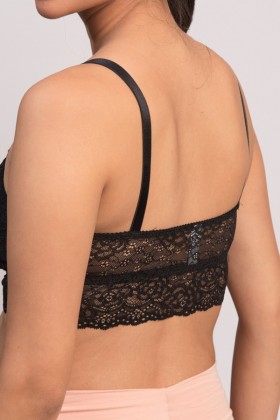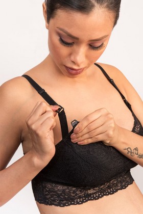 Bralette de lactancia en color negro, ideal para aquellas que buscan buena sujeción y llevar el pecho bien recogido. Realizado en encaje con tirantes ajustables.