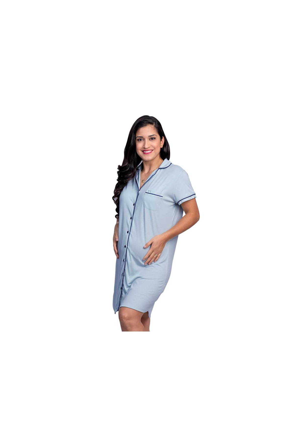 Descubre la suavidad y comodidad del camisero de maternidad y lactancia Paige Manga corta color celeste, diseñado en algodón pima de alta calidad para brindar una sensación ligera y transpirable.
