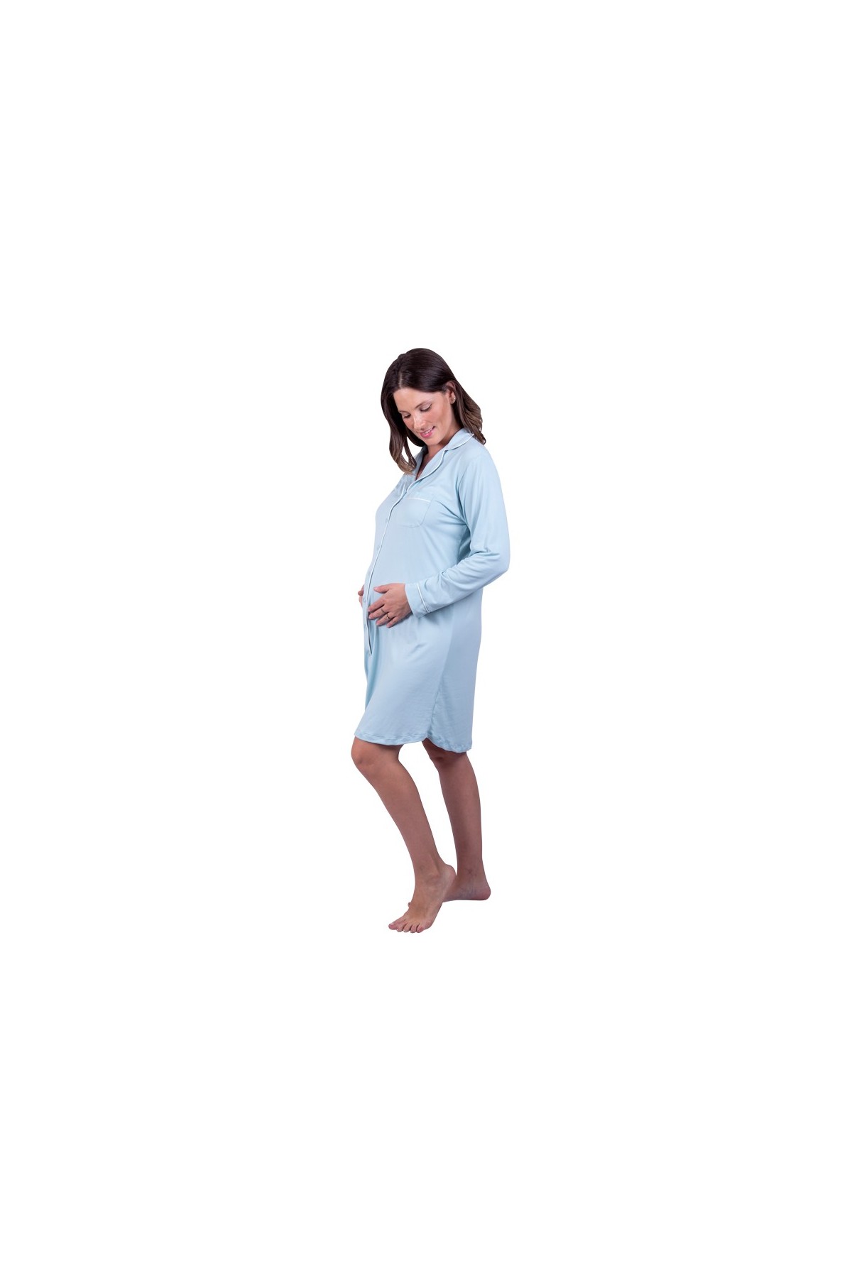 Lindo y cálido camisero de lactancia para clínica, modelo Paige, en suave tela color aqua.