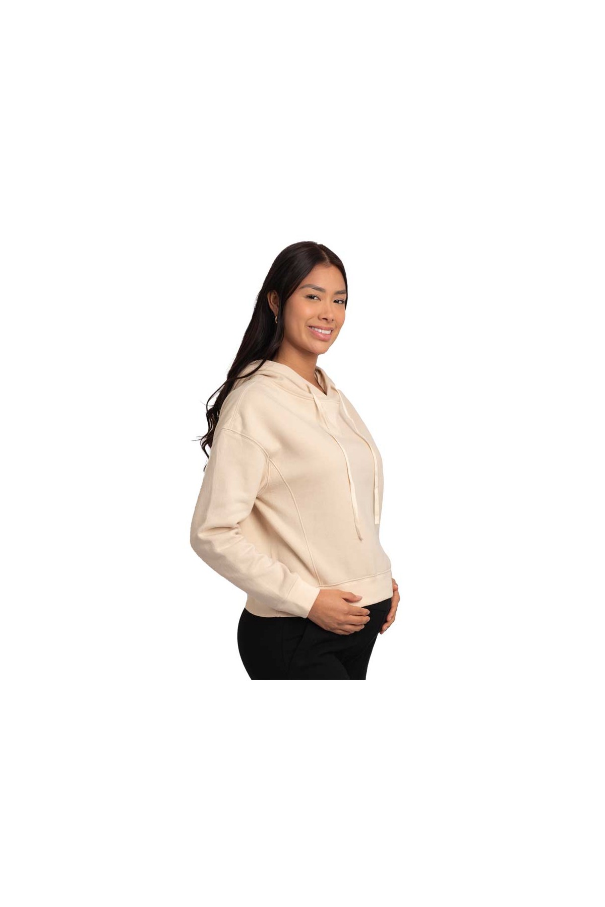 Polera Crema con detalles en el cuello, capucha , rib en mangas y en pretina.