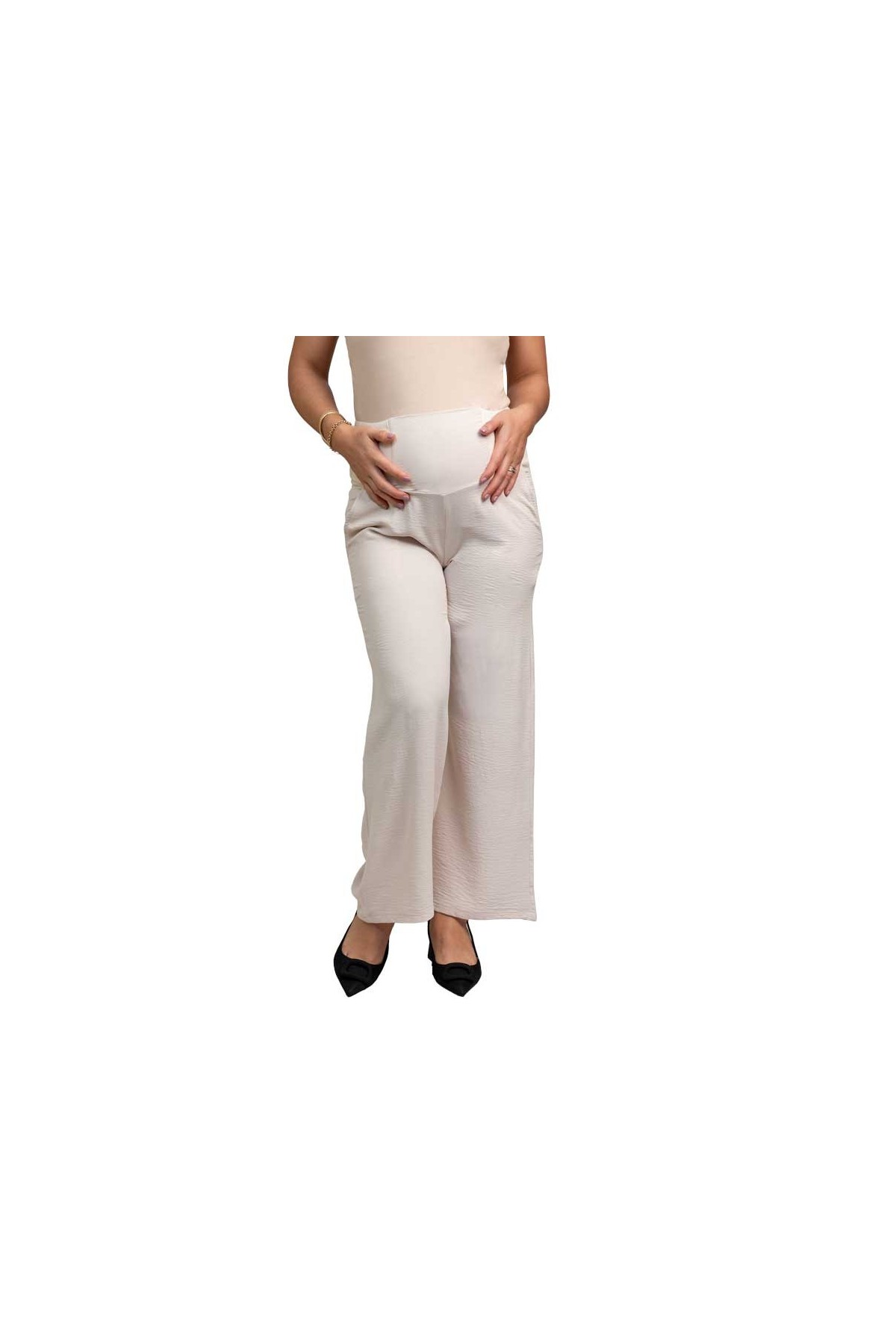 Clásico pantalón materno bota ancha estilo Palazo con pancita de algodón licrado color beige para mayor confort en el embarazo, ideales para la futura mamá que trabaja. Bellamente confeccionados en tela de primera calidad con elasticidad adicional.