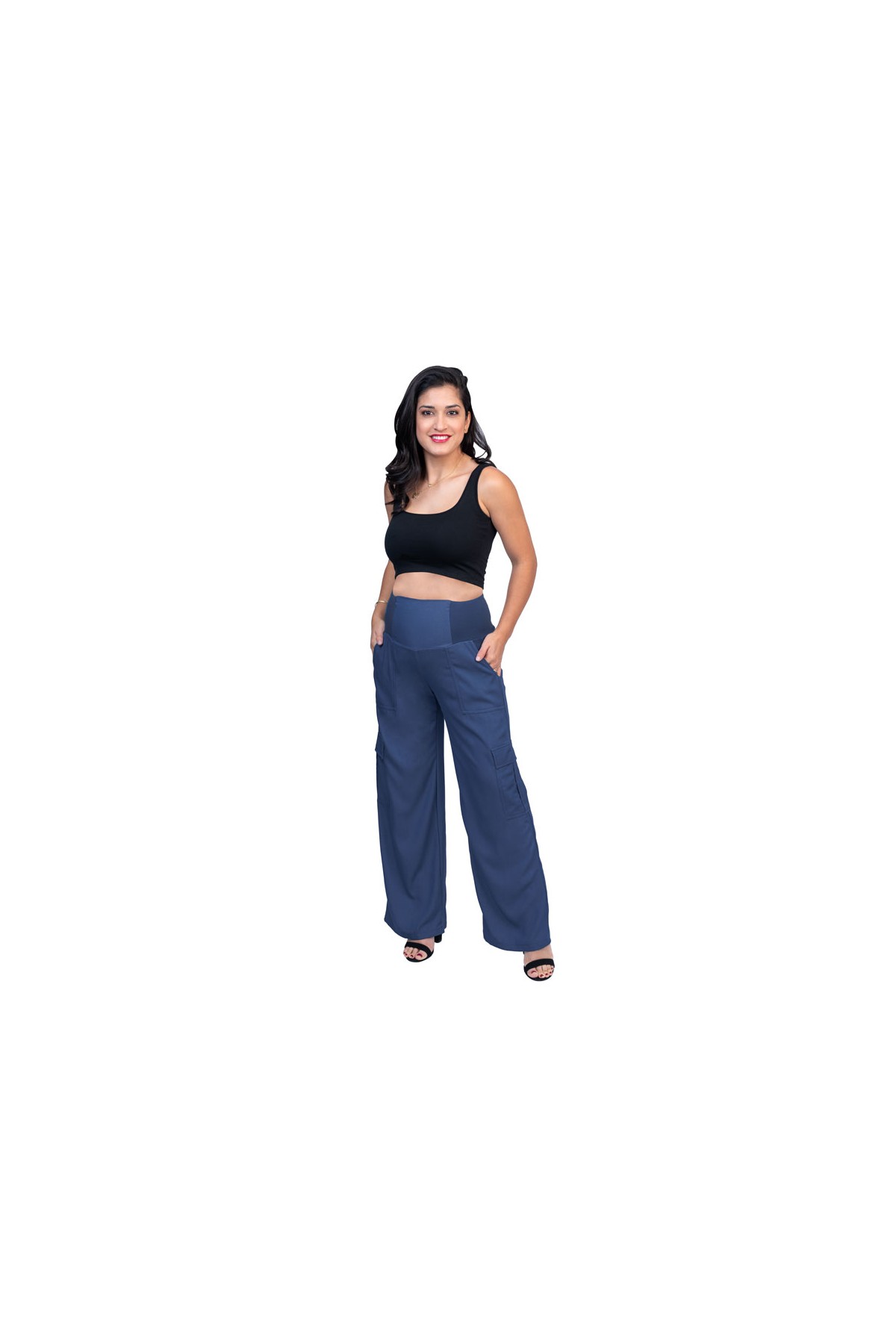 Clásico pantalón de embarazo bota ancha estilo Palazo, bolsillos cargo y con pancita de algodón licrado color denim para mayor confort en el embarazo, ideales para la futura mamá que trabaja. Bellamente confeccionados en tela de primera calidad con elasticidad adicional.