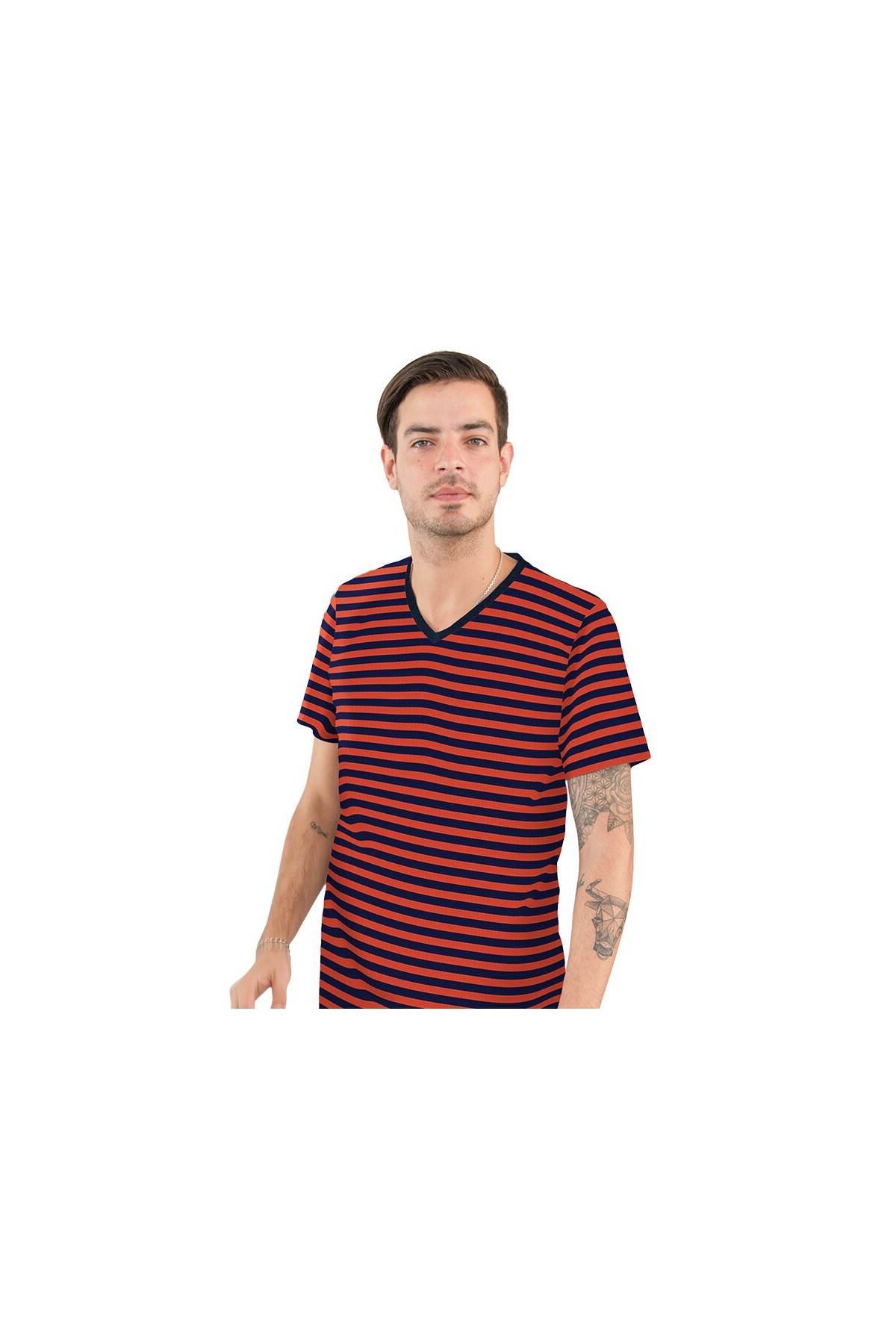 ➤ Polo manga corta con rayas azul y terracota.