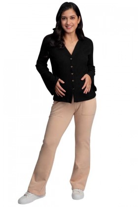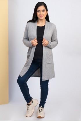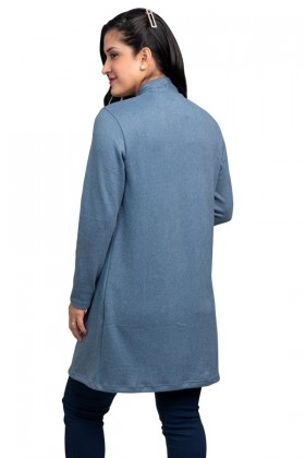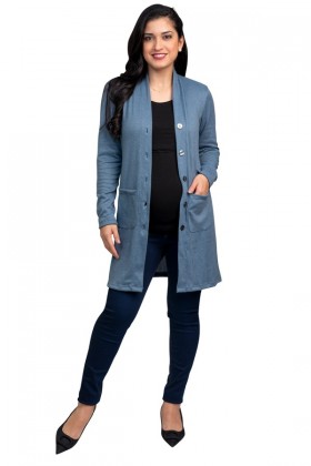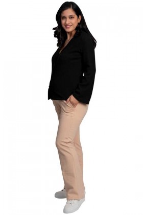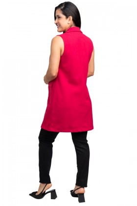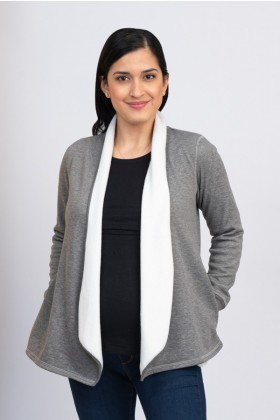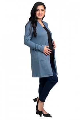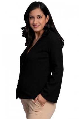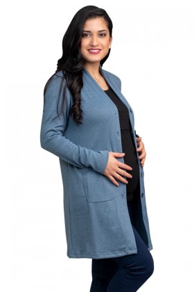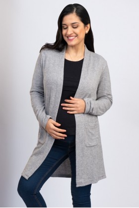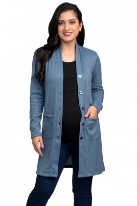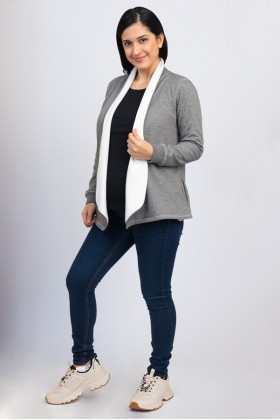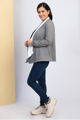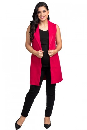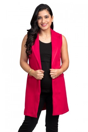 Complementa tu estilo maternal con este elegante chaleco de paño sin mangas tipo blazer, perfecto para mantenerte abrigada sin perder el toque moderno.