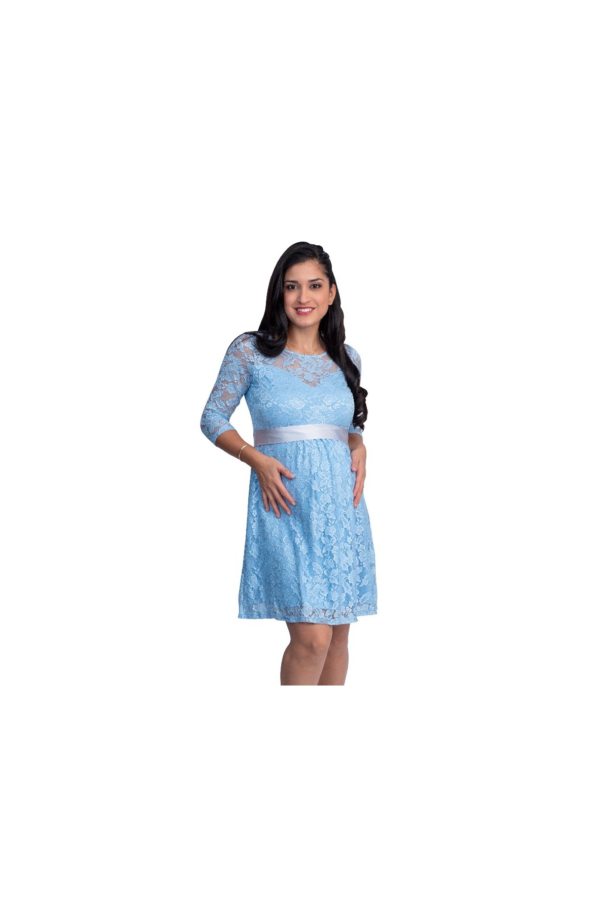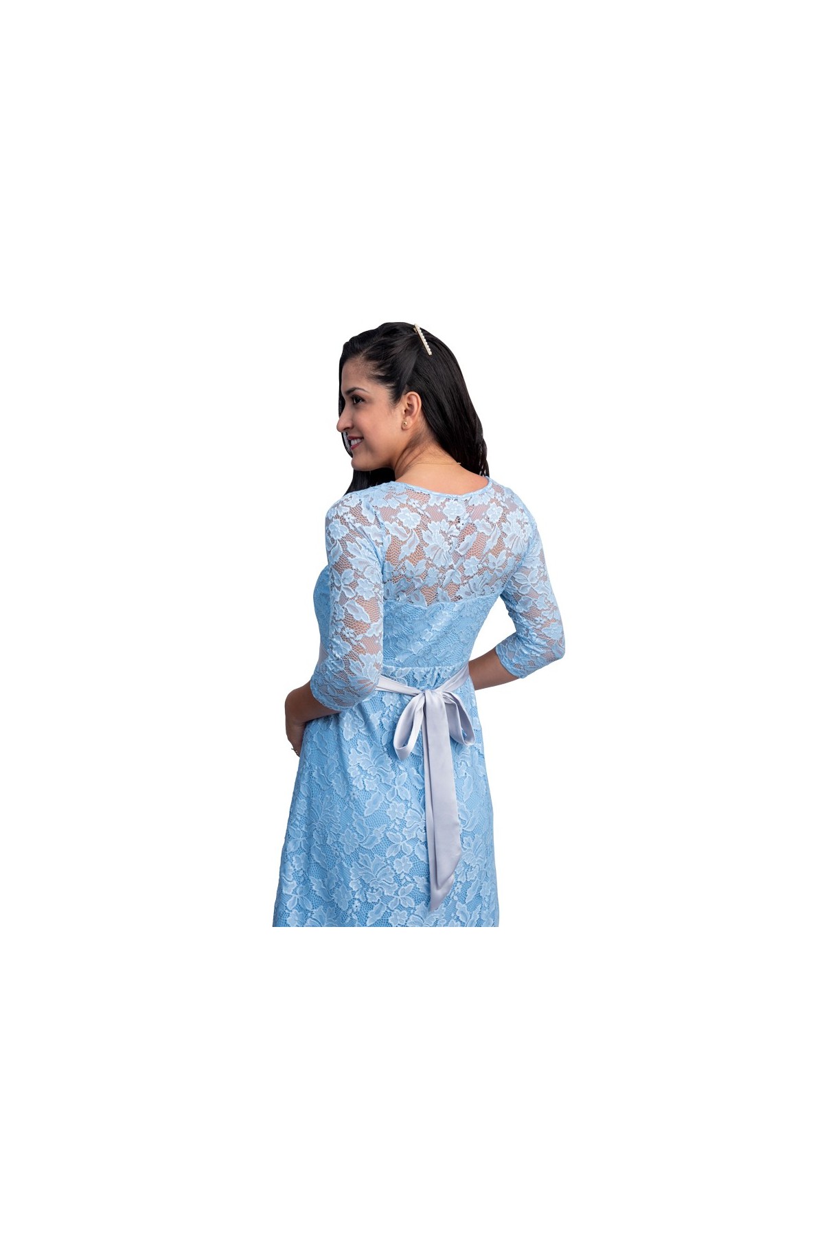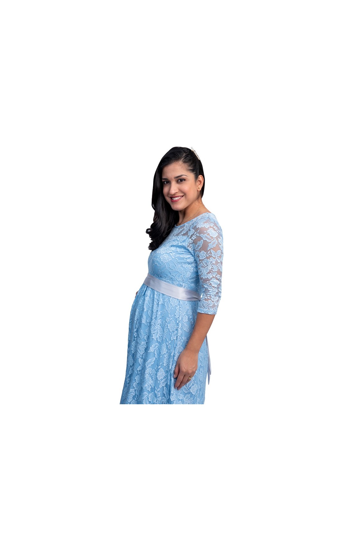 Nuestro moderno vestido de Novia premamá ó para Baby Shower color celeste esta hecho en un encaje elastizado que define hermosamente tus curvas, forrado con un suave tejido.