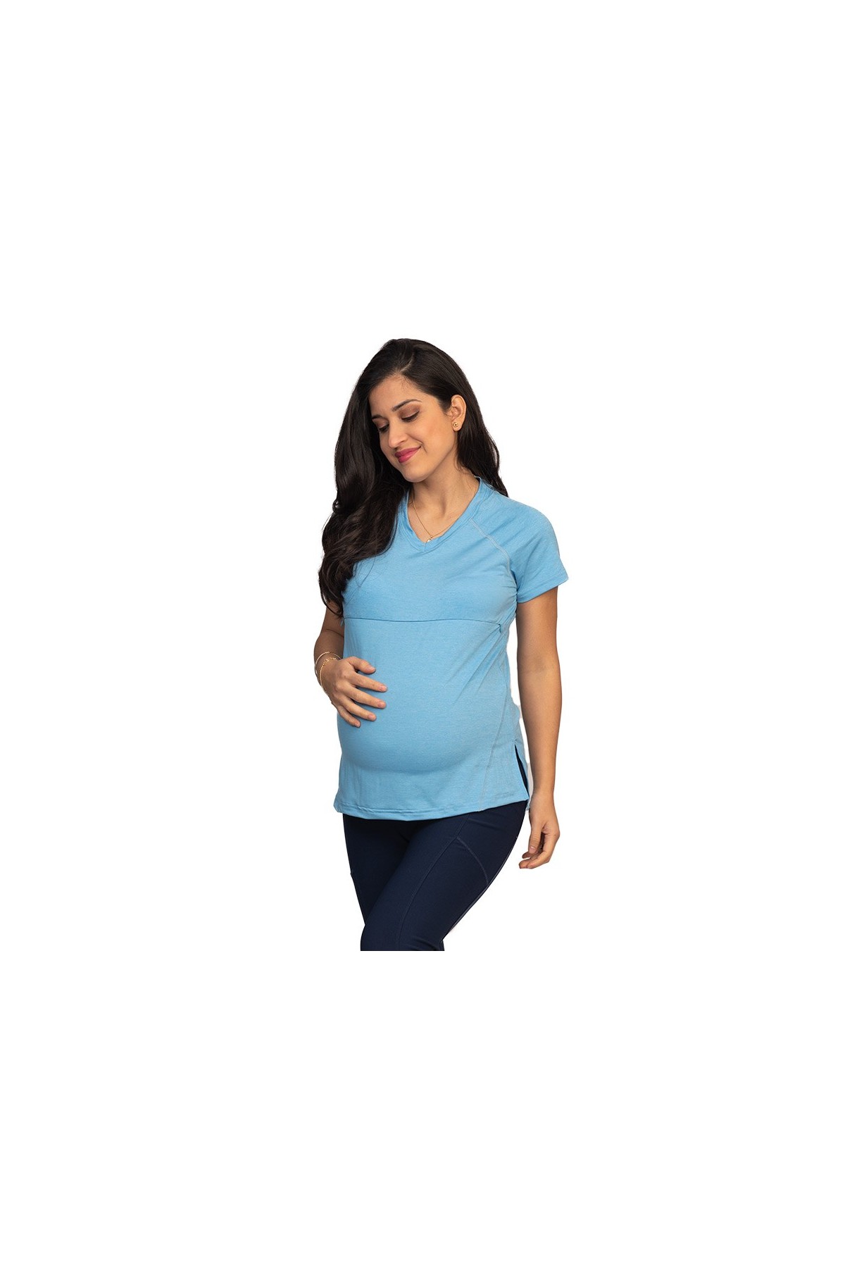 Camiseta de maternidad y lactancia color Celeste con aperturas de cierres invisibles para brindar confort a la lactancia materna.